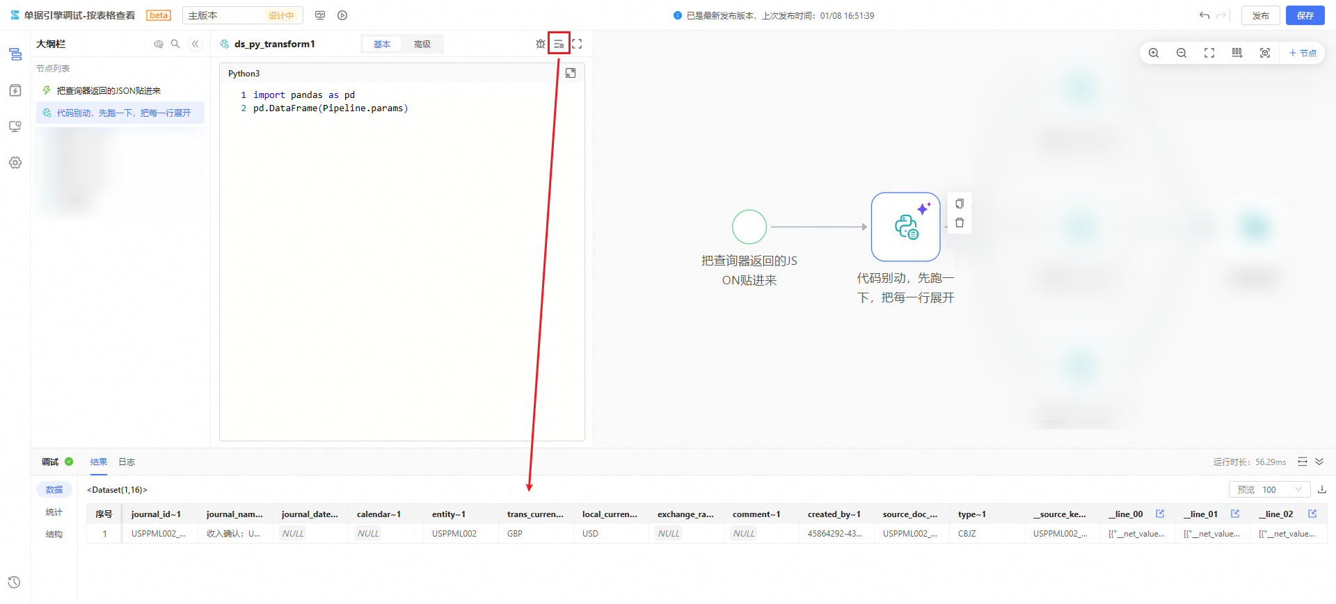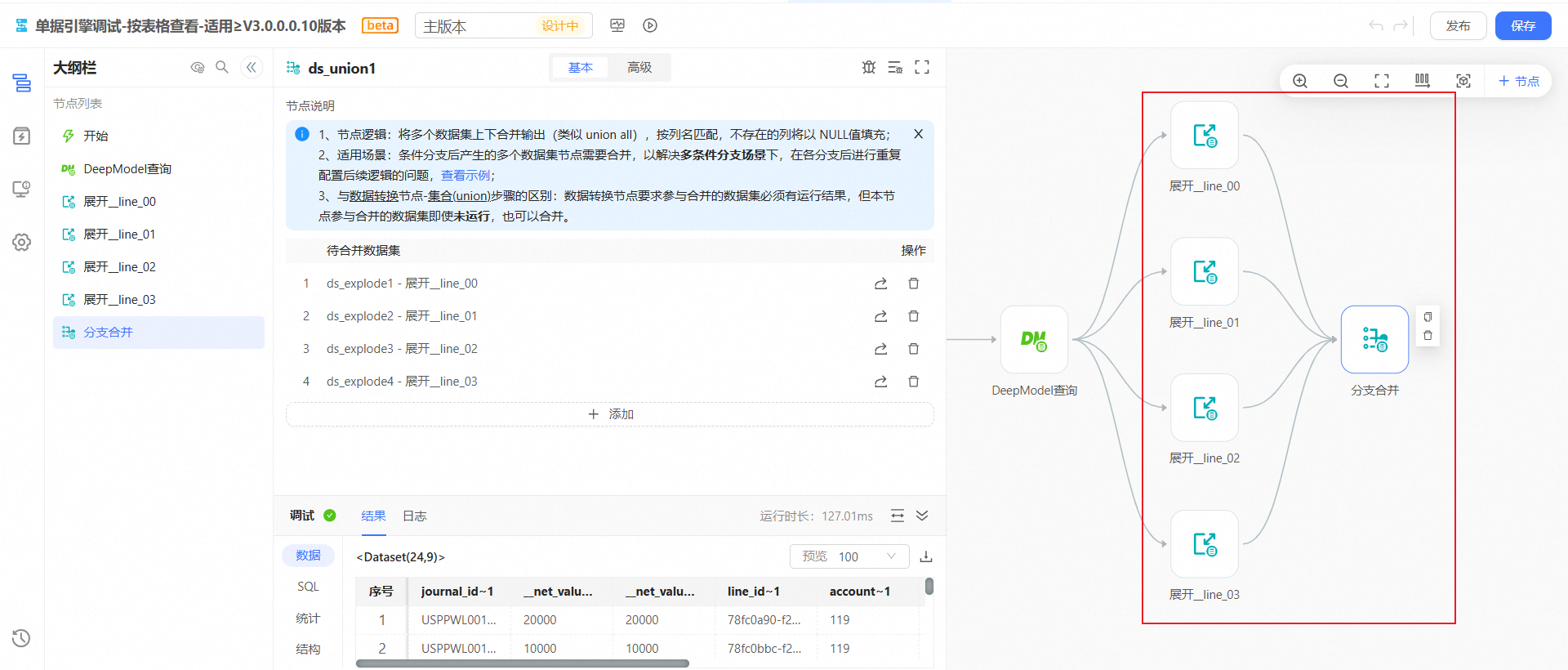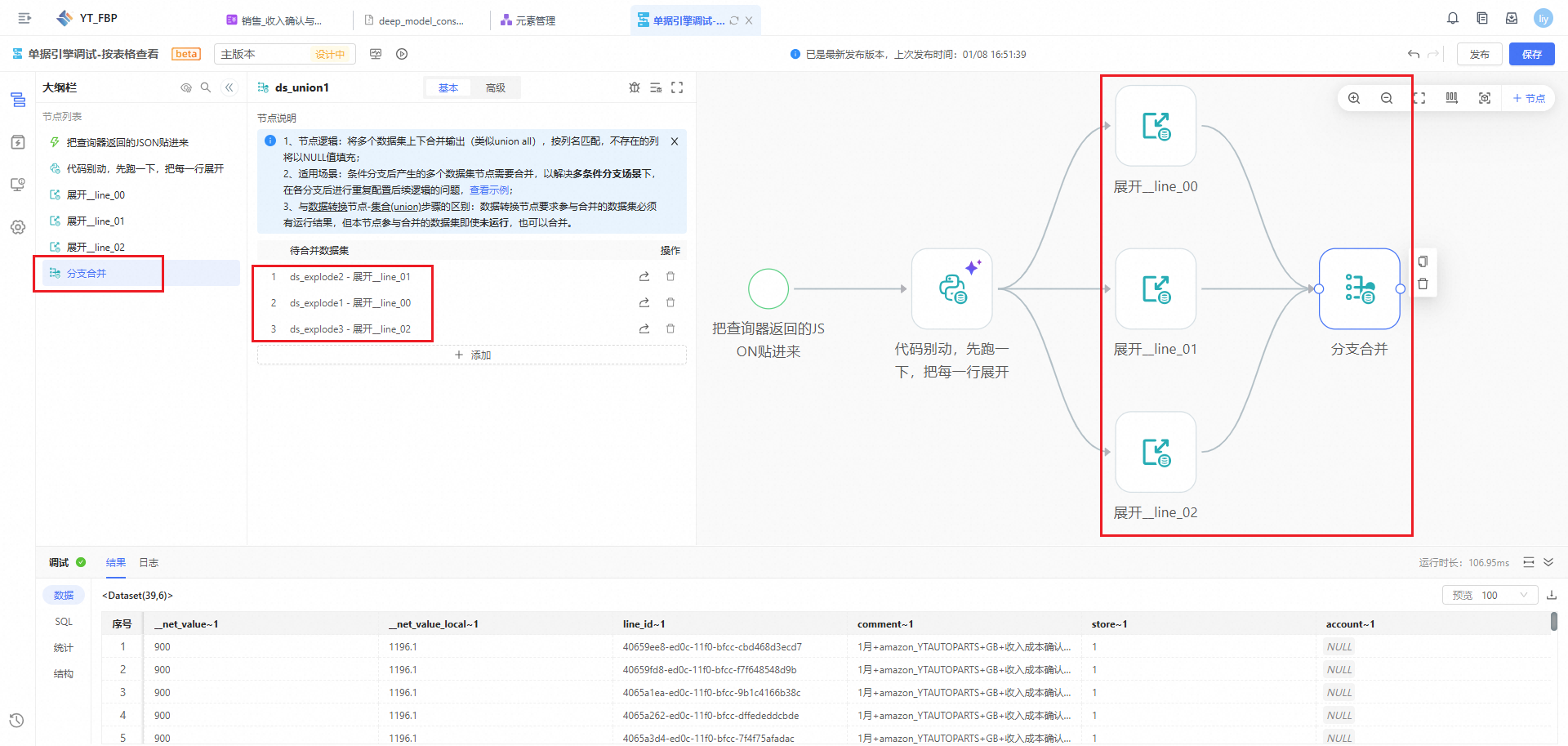 4)再用分支合并节点,把展开的行表合并,带前序一起调试,按报错排查问题