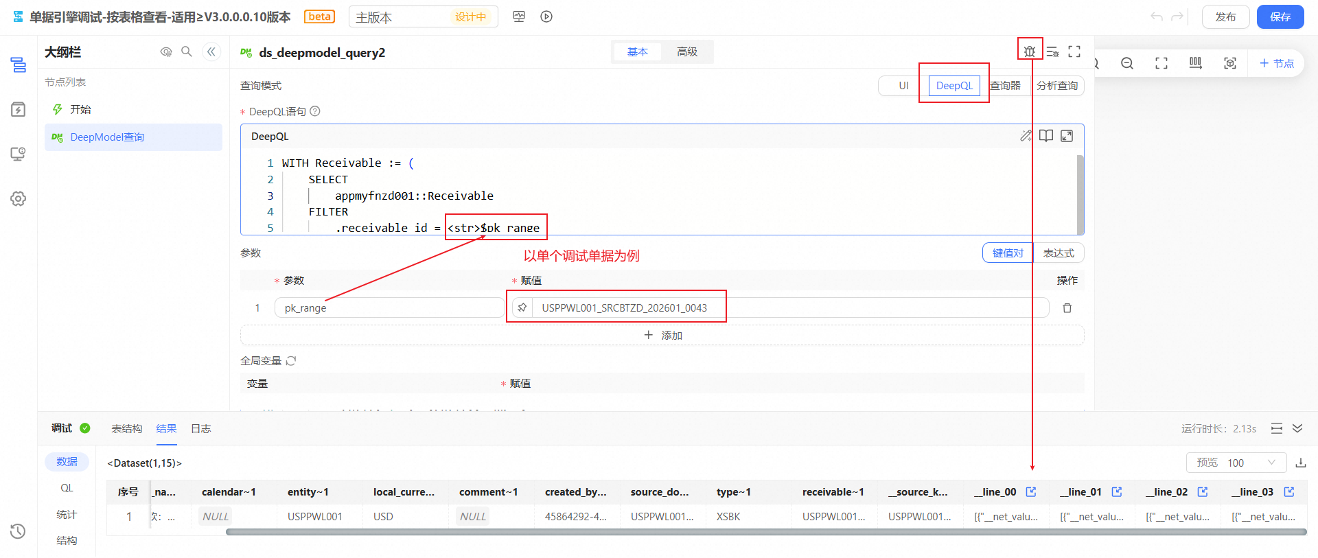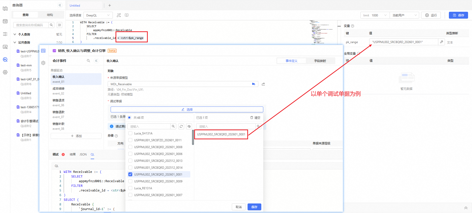 若多个调试单据,在≤V3.0.0.0.9版本,QL中用到的是包含关系:contains(array_agg(<str>json_array_unpack(to_json(<str>$pk_range))), .业务主键属性编码),需要粘贴形如"[\"key1\", \"key2\"]"的来源单据业务主键值