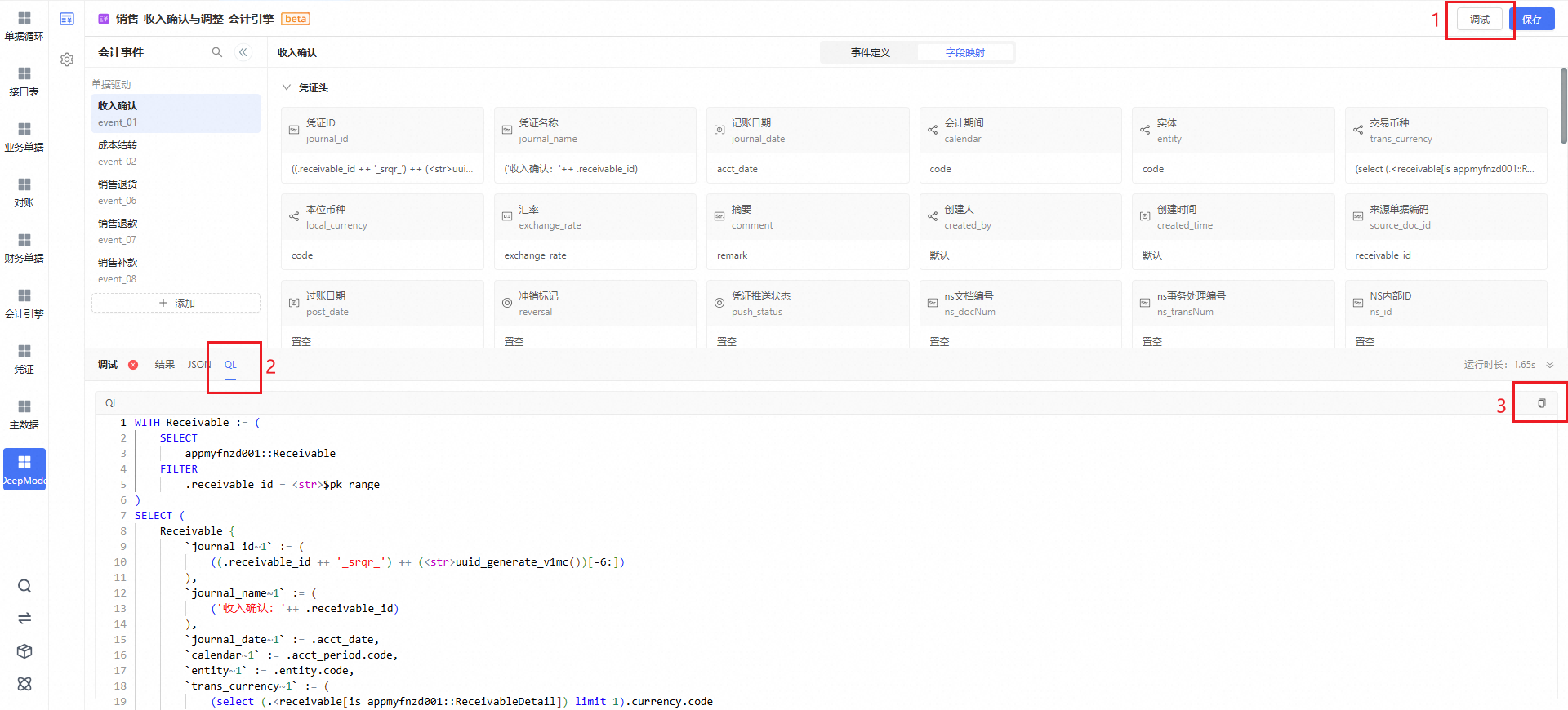 若多个调试单据,QL中用到的是包含关系:contains(array_agg(<str>json_array_unpack(<json>$pk_range)), .业务主键属性编码),则需要用表达式类型复制,粘贴形如["key1", "key2"]的来源单据业务主键值列表。你可以在调试单据配置处,快速复制出业务主键列表。