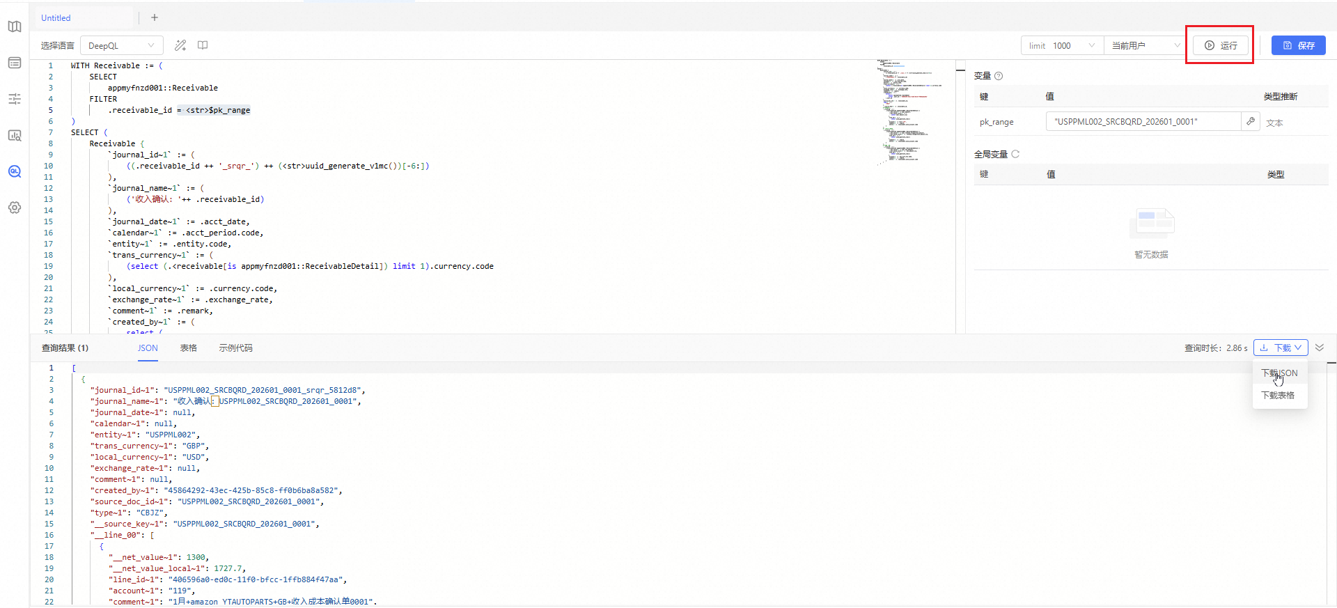 若运行成功,则是在将运行结果组组合为表格时出现问题,请复制或下载出返回结果的JSON,进行后续排查