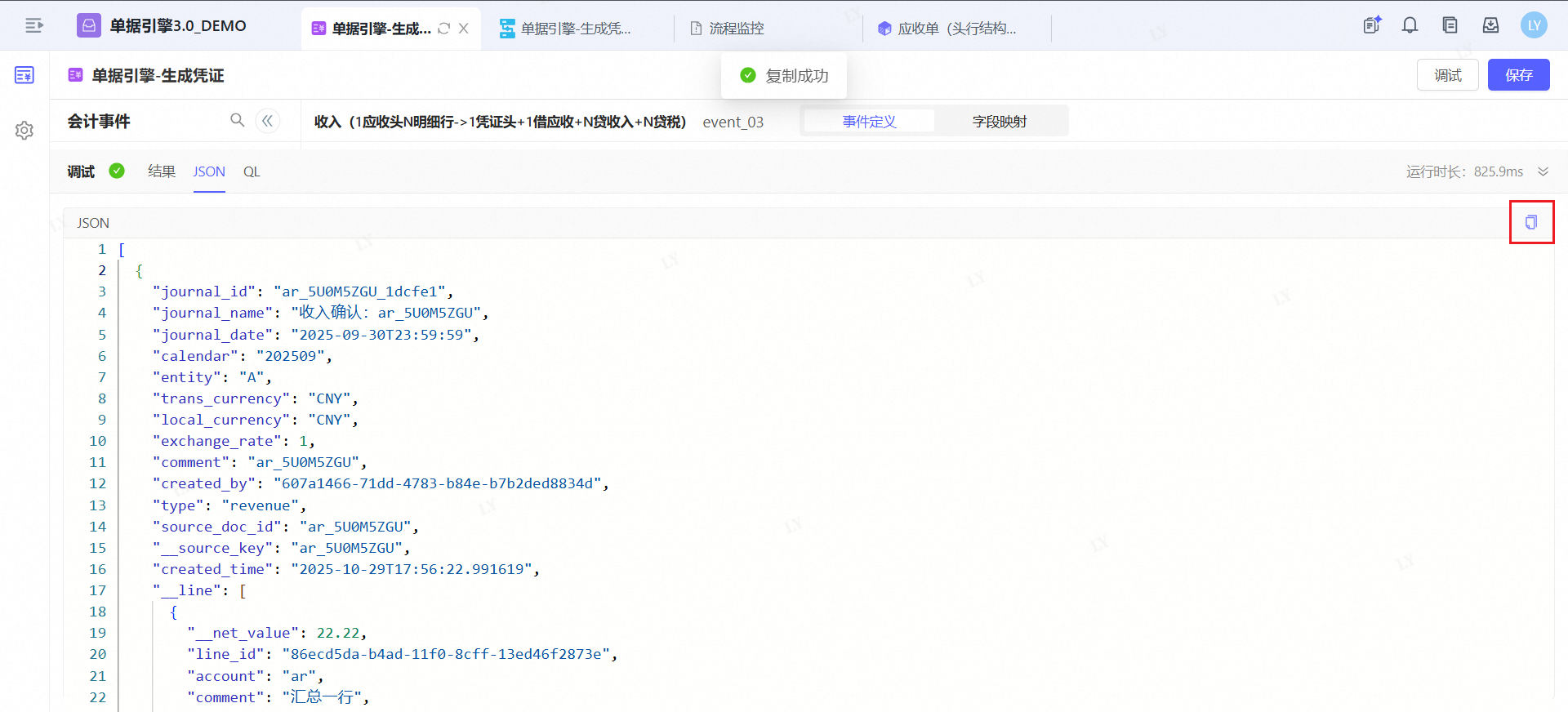 调试接口返回的原始json格式的凭证数据,可快速复制: