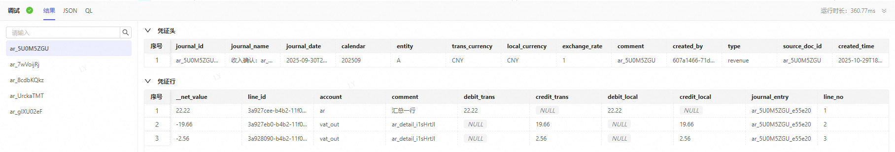 左边展示生成的凭证列表,可模糊搜索,右边展示选中的凭证的凭证头和凭证行表格: