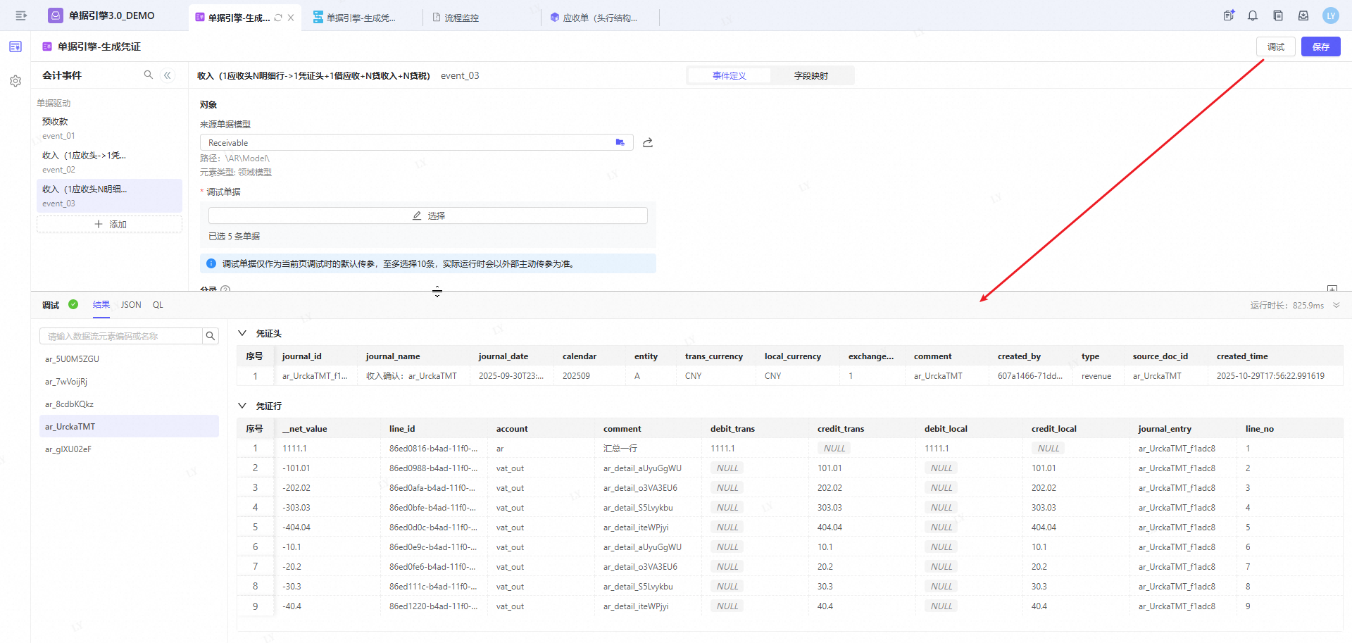 单据引擎提供调试功能,可以将保存后的配置,结合选择的调试单据,生成调试数据。