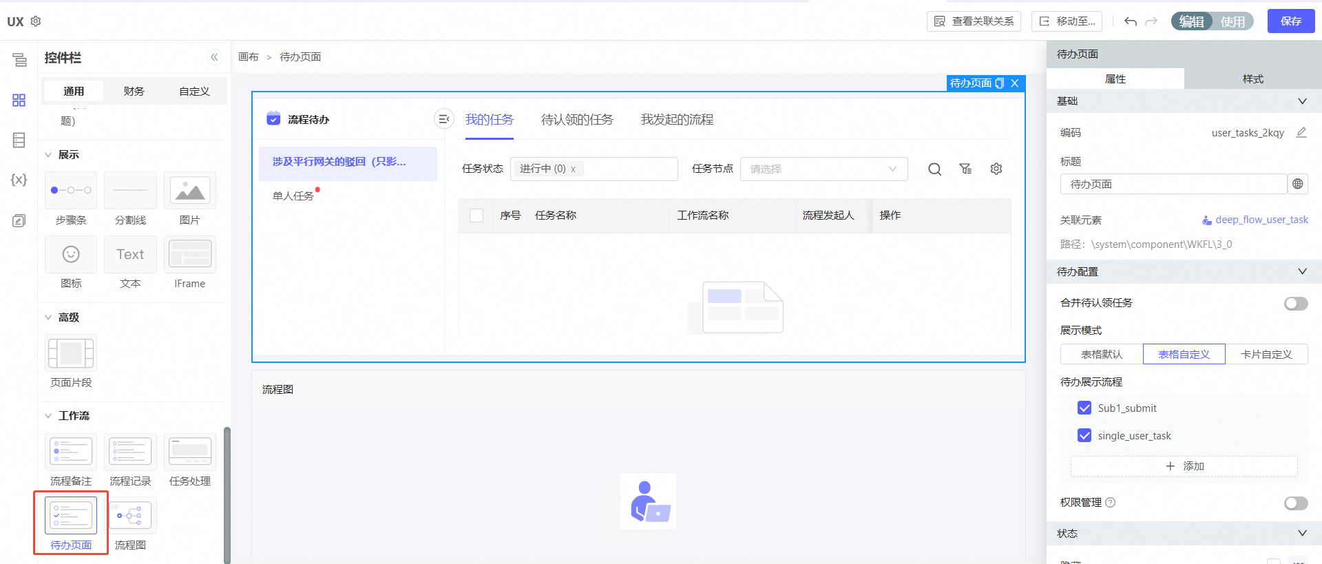 工作流的任务处理可以在UX元素中操作,同时也有很多控件支持在UX元素中配置,此处统一说明如何在工作流中关联一个UX元素,同时实现需要的数据传递。