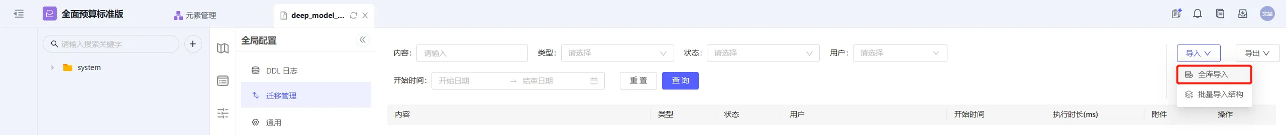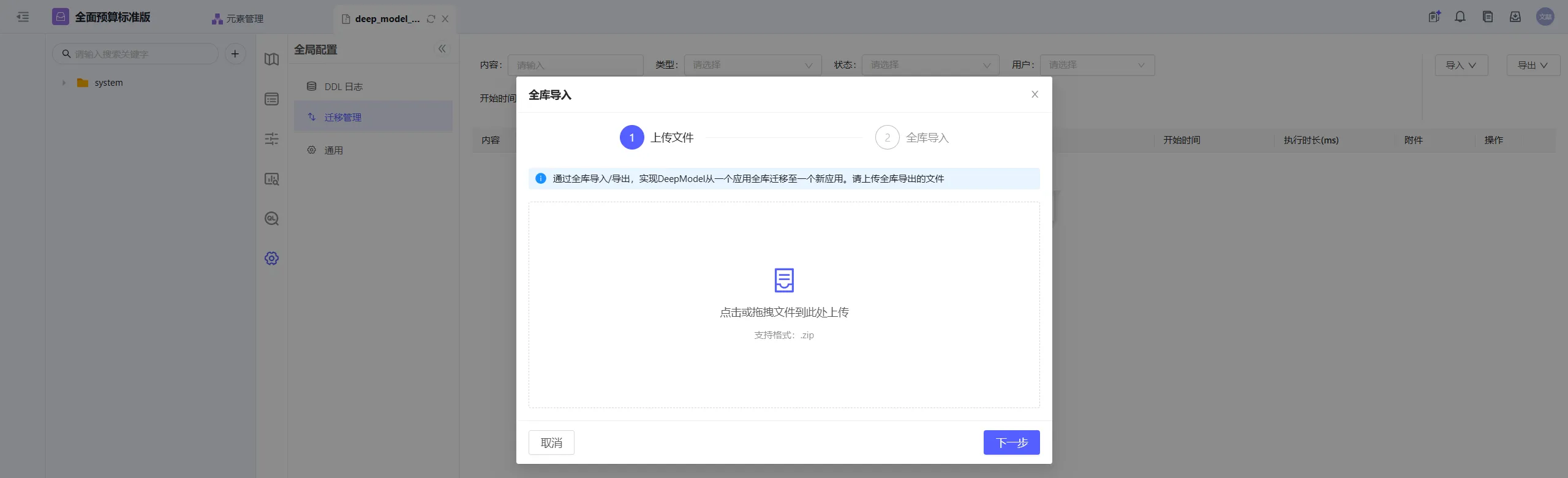 目标应用进入DeepModel控制台->全局配置->迁移管理,上传导出文件,全库导入对象结构、配置与对象数据