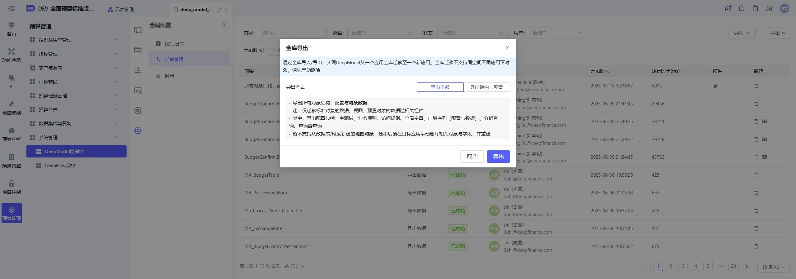 源应用进入DeepModel控制台->全局配置->迁移管理,全库导出对象结构、配置与对象数据