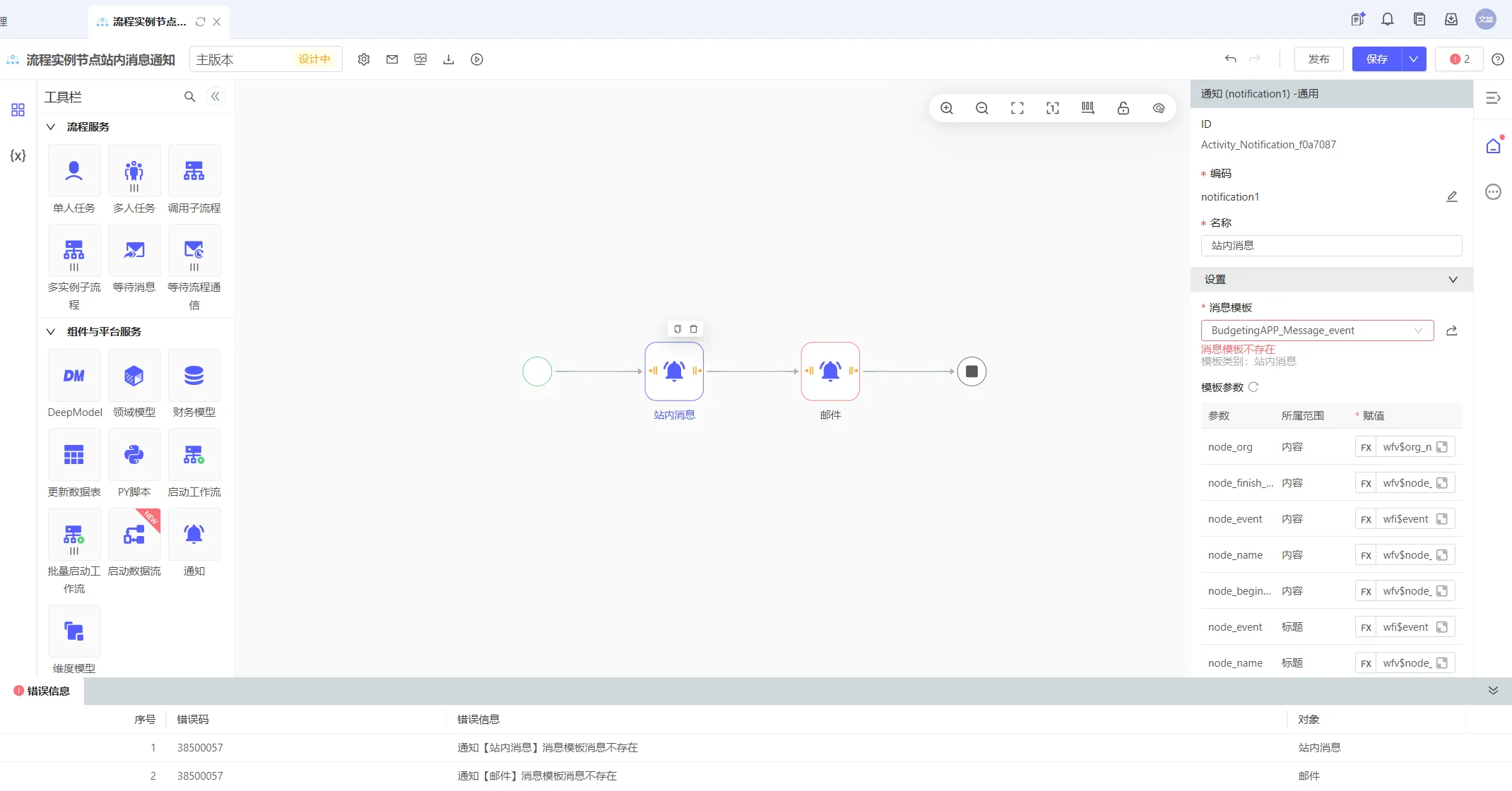 问题:打开工作流或数据流,显示异常信息:消息模板不存在