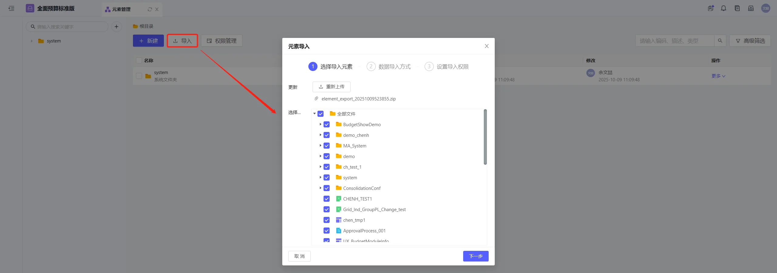 目标应用进入元素管理,上传导出文件,导入元素