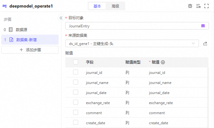 以上一步生成的凭证行为数据源,按journal_id去重,只保留凭证头需要的字段即可: