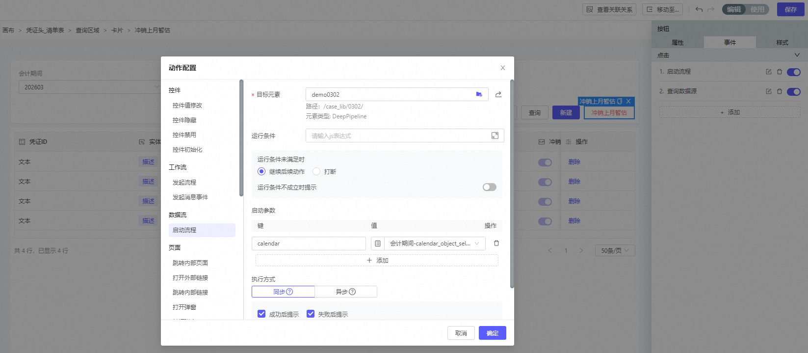 1. 在开始节点配置启动参数{"calendar":"202603"},用于指定当前期间,后续需要用此参数找上月需冲销凭证、生成本月凭证