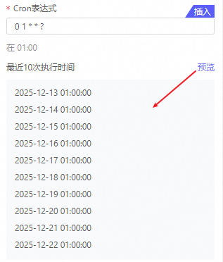输入表达式后,会实时解析该规则的描述,展示在表达式下方,并且提供预览最近 10 次执行时间的功能,用以辅助您检查表达式是否正确。