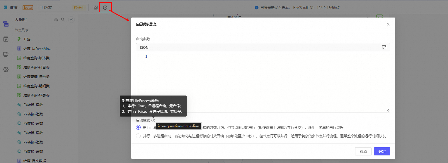 在数据流编辑界面运行,可选的两种启动模式,即对应了InProcess参数的两个值。