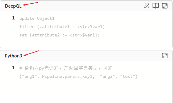 1、在DeepQL中先定义变量,定义的方法和在DeepModel中使用查询器时完全相同,详见DeepModel组件相关文档。如 <str>$var,其中 <str> 为声明类型,var 为变量名,且变量 var 必填;如 <optional str>$var,optional 表示变量 var 非必填;