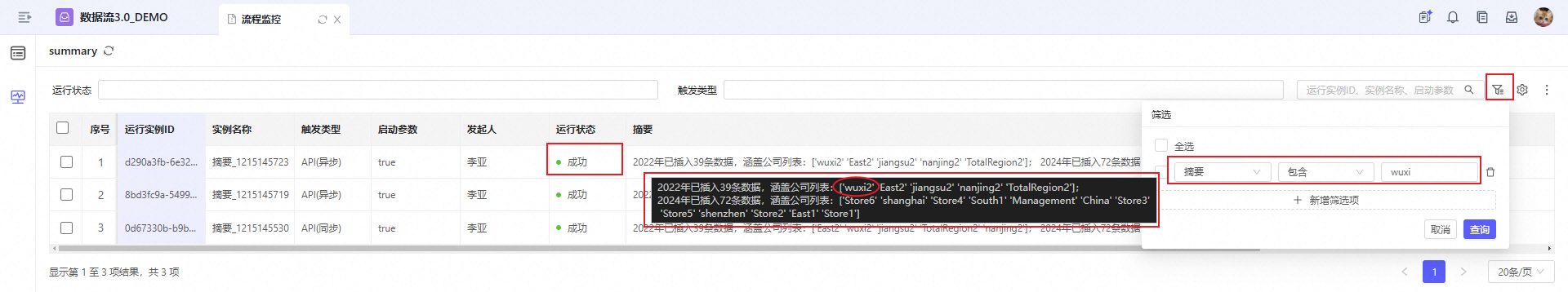 该节点的效果应用在流程监控的【摘要】列中,该列支持作为文本进行高级筛选。