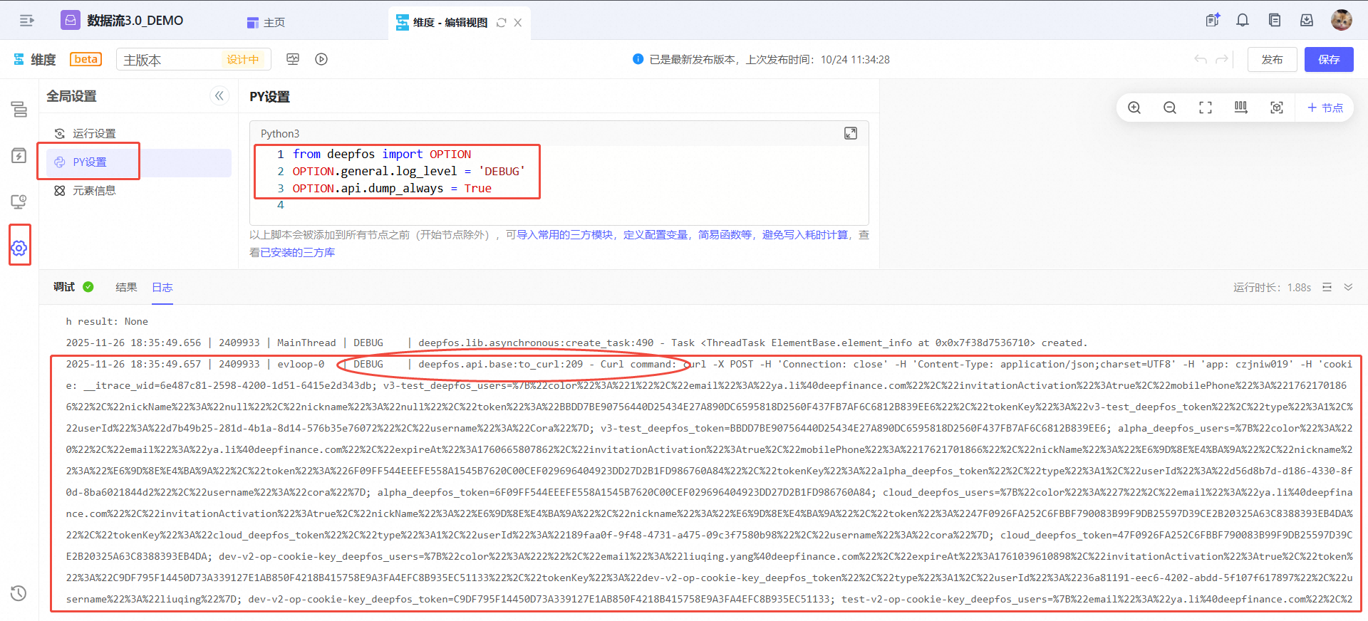 在公共脚本中添加一段PY代码**,以在该节点的日志中获得调用组件服务的debug级别的日志,包含详细的cURL,包含提交给组件服务的详细数据,您可以排查提交的这些数据是否有误。代码:
